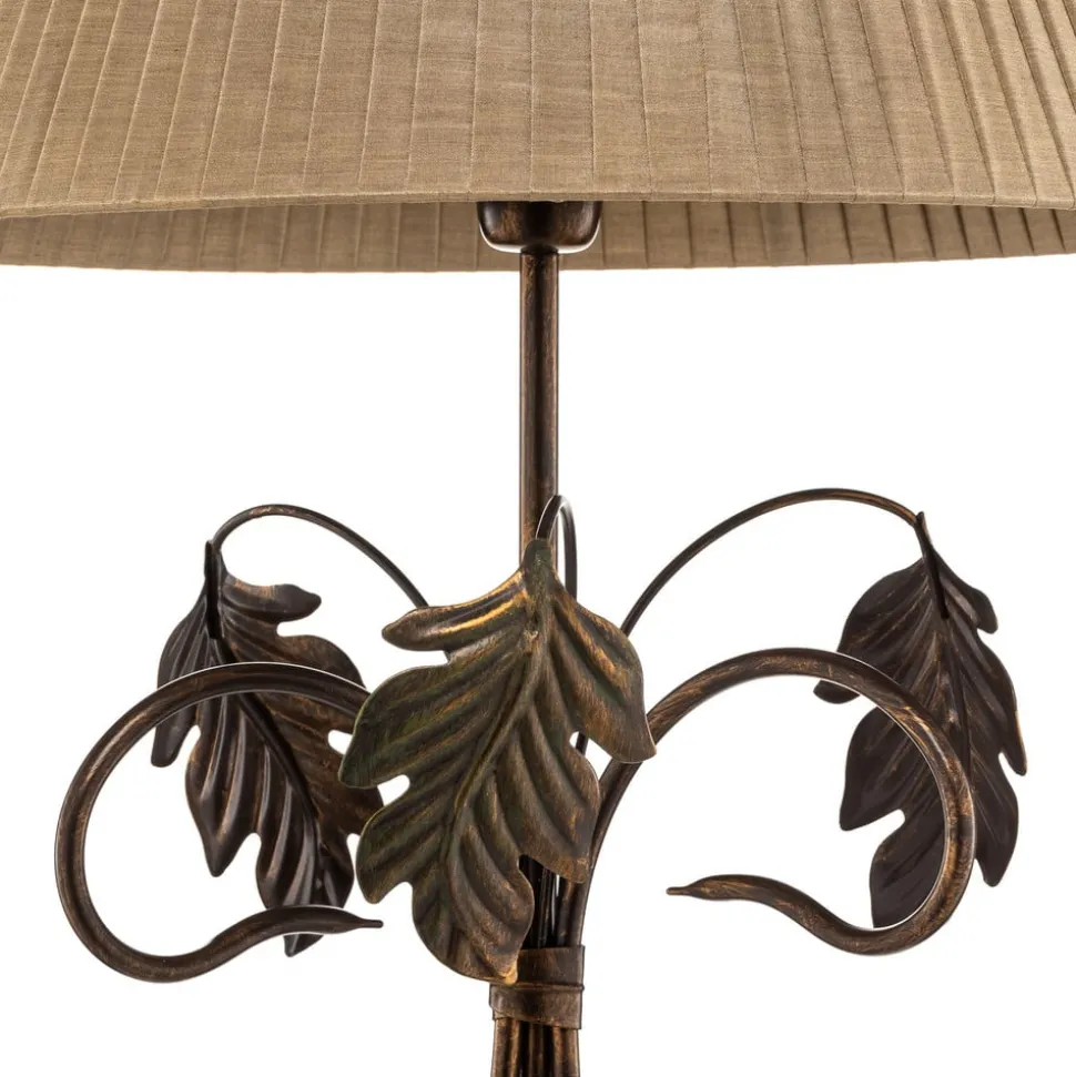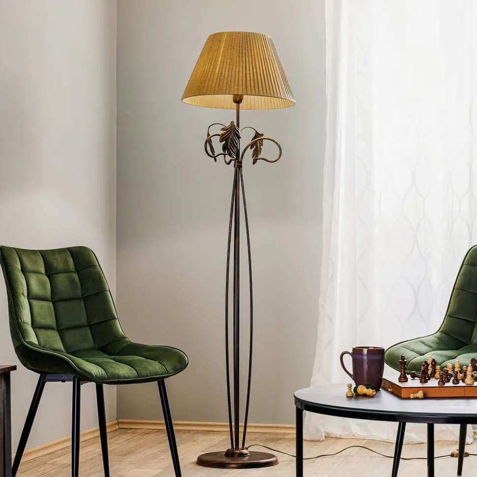 De vloerlamp Quercia combineert Florentijnse stijl met een vleugje antiek en is daarmee een blikvanger in elke ruimte. De kunstig vormgegeven stoffen kap in crèmewit harmonieert perfect met de bronskleurige, antiek ogende metalen accenten en de filigrane eikenbladeren in groen. Deze combinatie van textiel en metaal geeft de lamp een tijdloze elegantie die zowel in de woonkamer als in de slaapkamer of eetkamer een warme en uitnodigende sfeer creëert.
