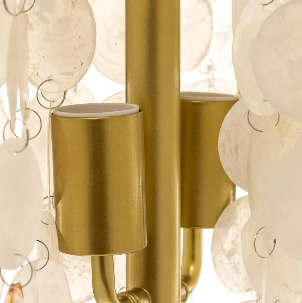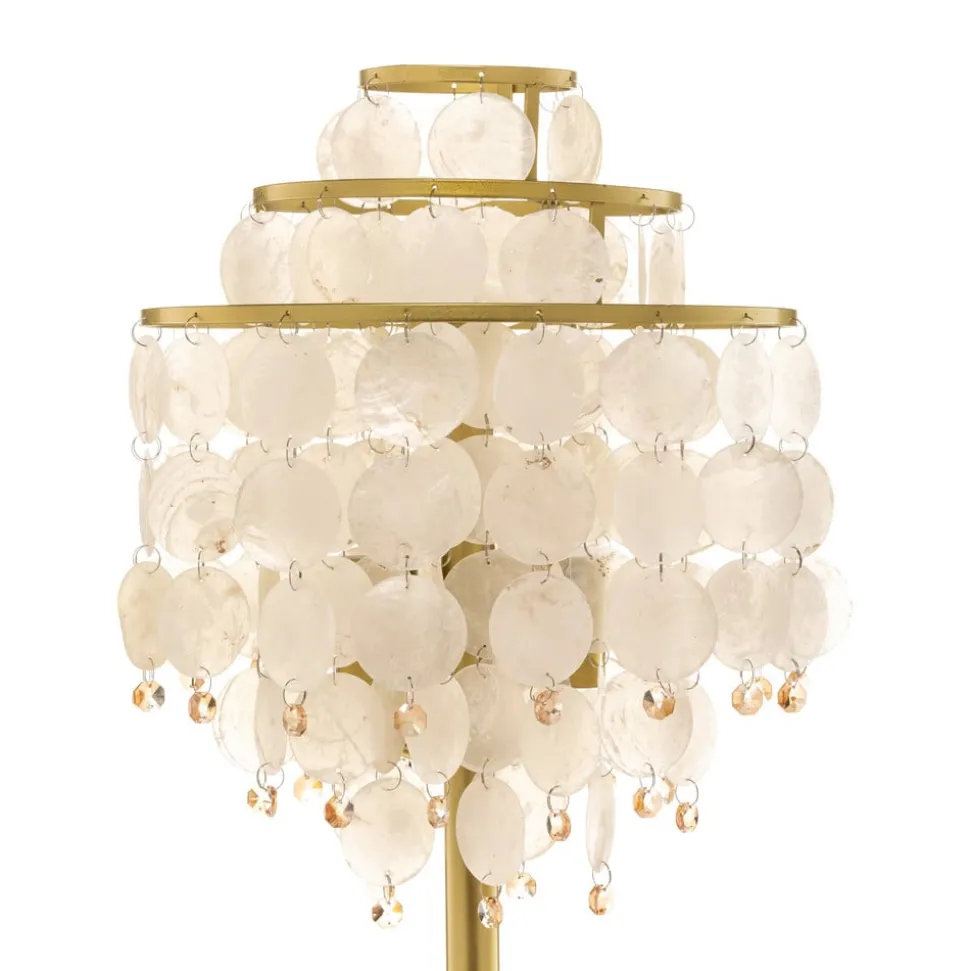 De vloerlamp Ruben met parelmoerschijven combineert edele materialen en een stijlvol design. Hij is gemaakt van hoogwaardig metaal en versierd met glanzende parelmoerschijven en geeft elke woon- of eetkamer een luxe accent. De gouden kleur harmonieert perfect met de natuurlijke tinten van het parelmoer en creëert een warme, uitnodigende sfeer.
