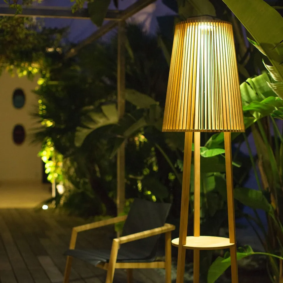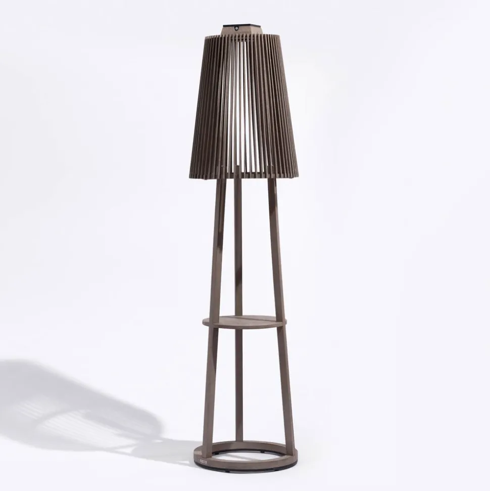 Maar de LED-zonnelamp Tecka is niet alleen functioneel, maar ook visueel een schot in de roos: de lamellenkap verdeelt het licht decoratief naar alle kanten en in het midden van het frame bevindt zich een kleine ronde plank.