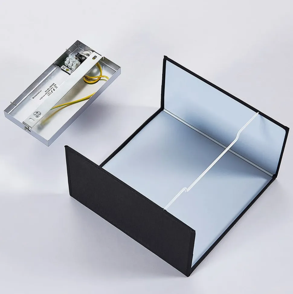 Voor een bijzonder gezellige lamp: de zwarte wandlamp Adea wandlamp van textiel Als je de wandlamp Adea van voren bekijkt, heeft ze een vierkante basisvorm en is ze ontworpen als een scherm, omdat het licht vrij naar boven en beneden kan ontsnappen. Op de andere punten zorgt de zwarte stof ervoor dat de lamp wat meer gedempt lijkt, maar des te gezelliger. Deze eigenschappen maken van Adea een prachtige lichtbron voor de woonkamer, die geaccentueerd licht creëert met een gezellig effect.