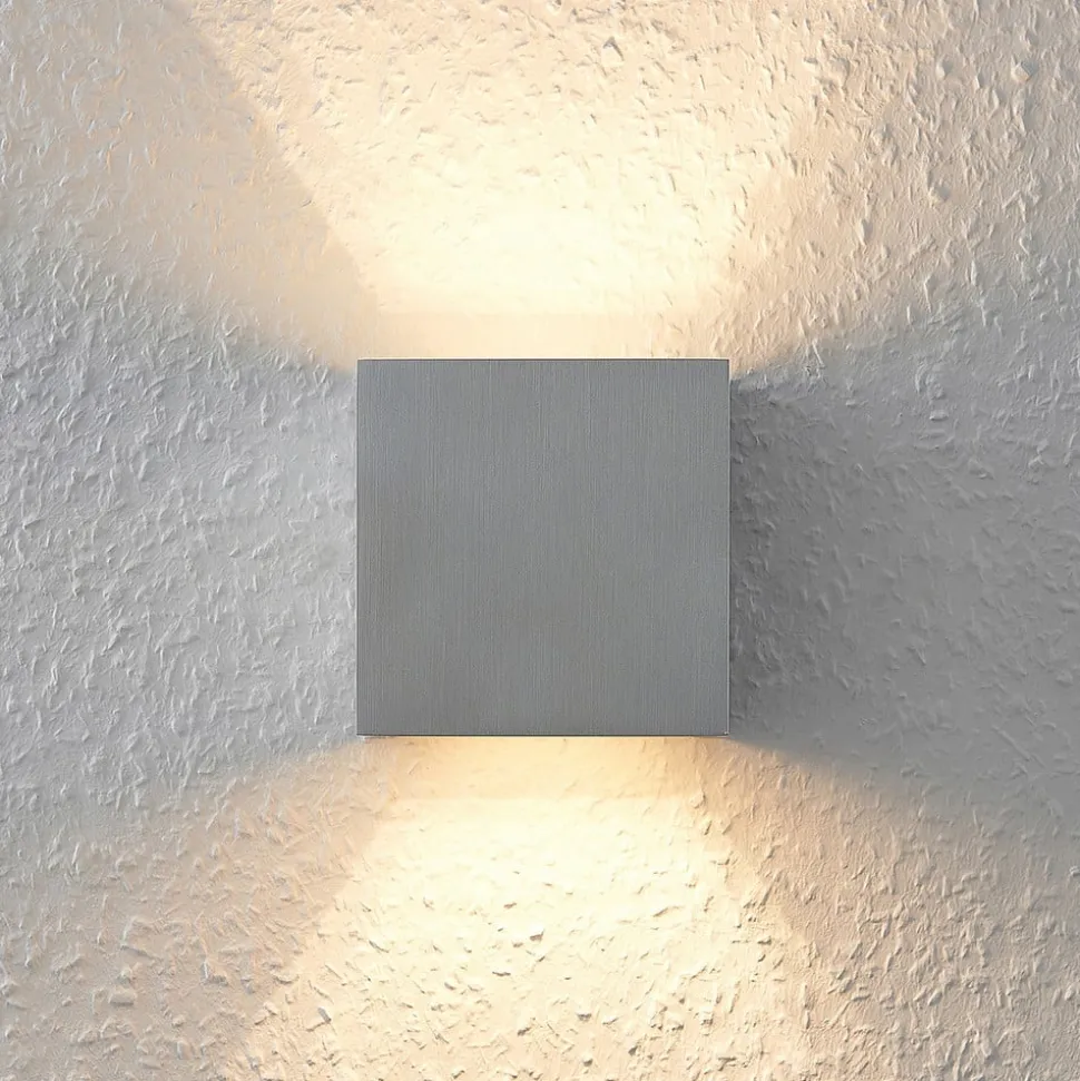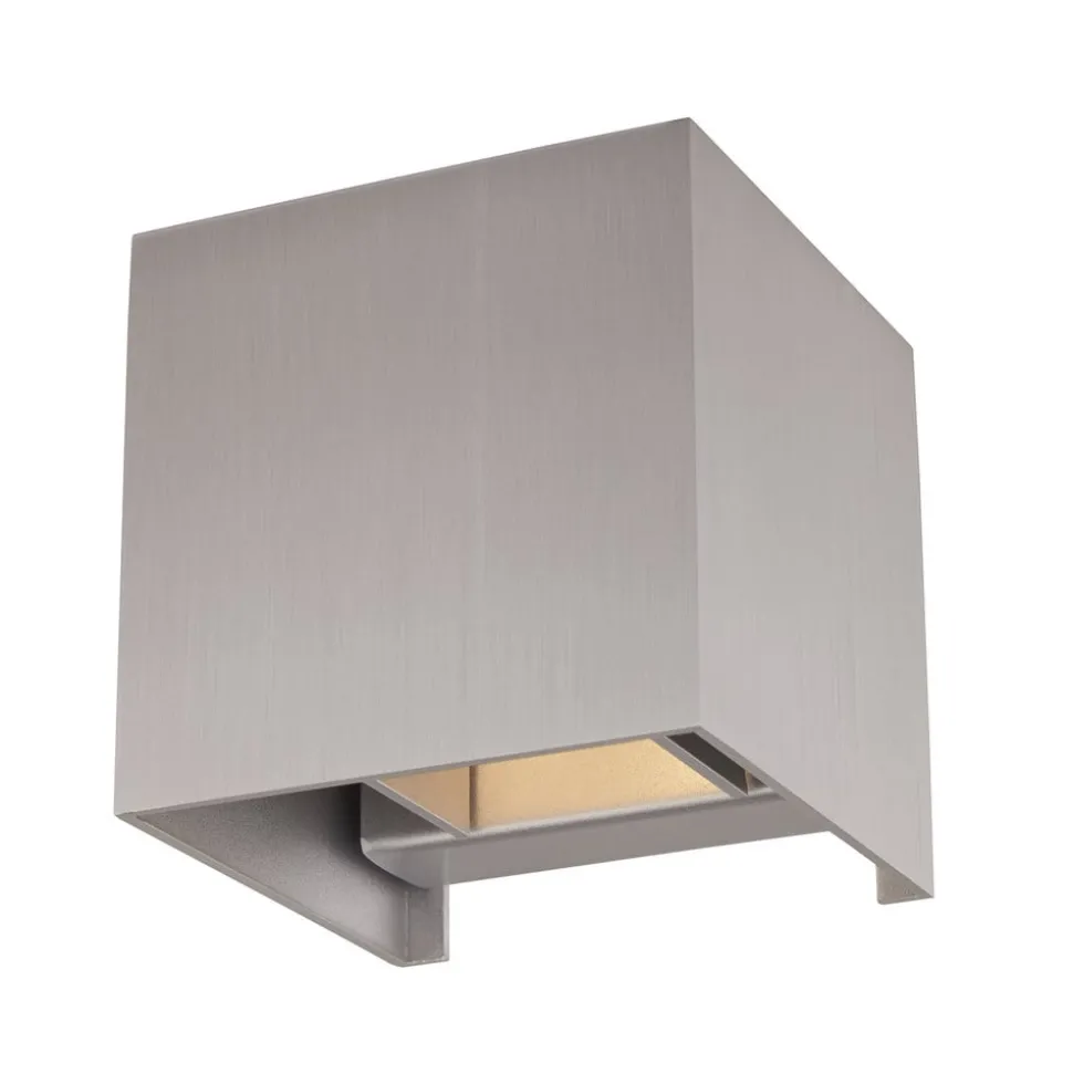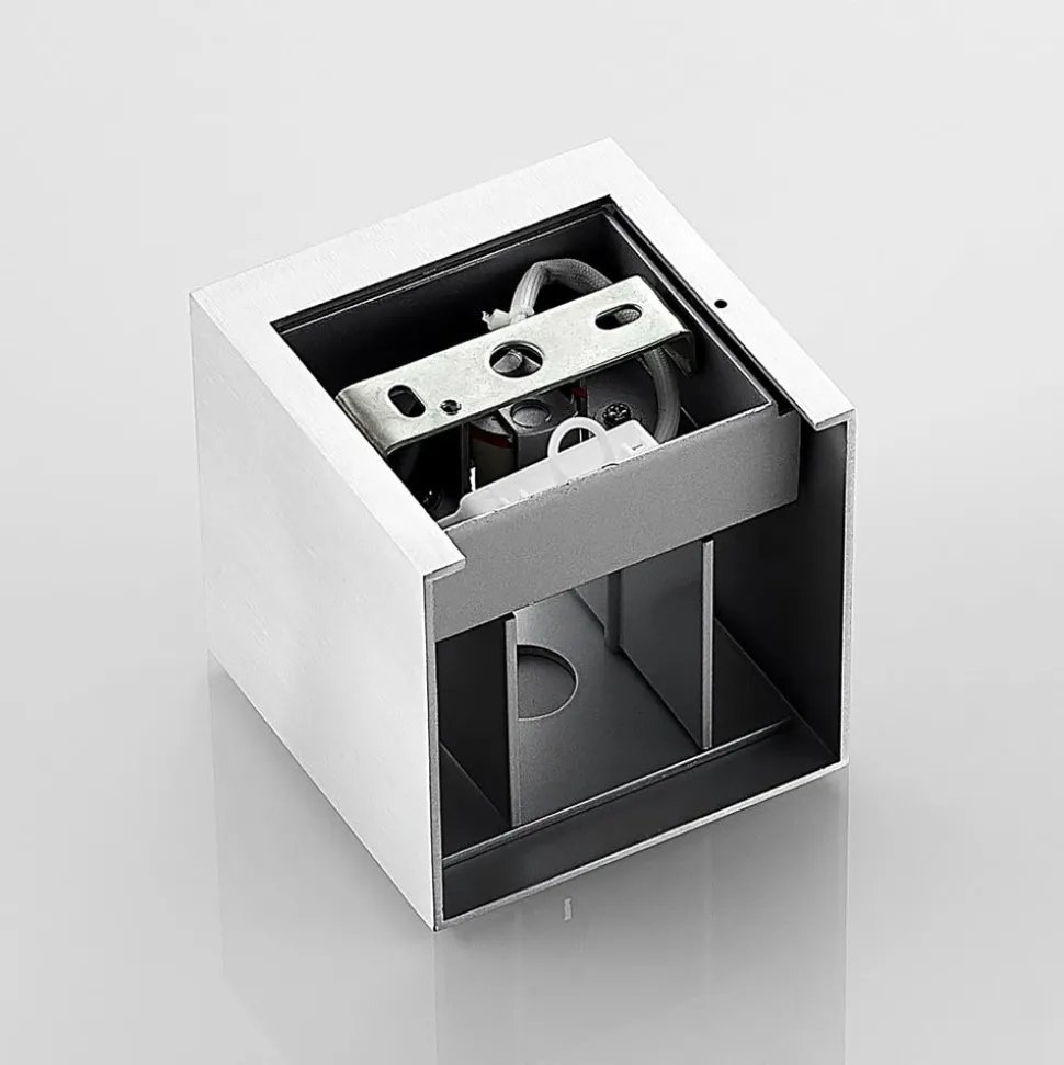 Kubusvormige wandlamp Zuzana van aluminium met verstelbare lichthoek Zuzana heeft een universele vorm en kan op veel verschillende manieren worden gebruikt, hoewel de lineaire ontwerptaal haar bijzonder geschikt maakt voor gebruik in moderne woonstijlen. De aluminium behuizing heeft een natuurlijke afwerking en, met zijn zilverachtige tint, een ietwat koeler effect dat goed past bij een zeker purisme in het woondesign. Bovendien kan de lichtuitstralingshoek van deze wandlamp naar wens worden aangepast, zodat de hoek boven en onder gelijk is of een smalle hoek kan worden gecombineerd met een brede om een zeer stijlvolle totaalindruk te creëren die pas echt tot zijn recht komt wanneer de wandlamp is ingeschakeld.