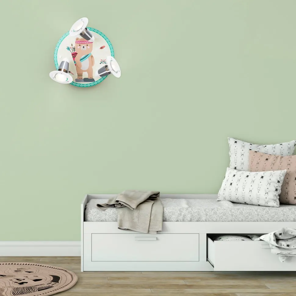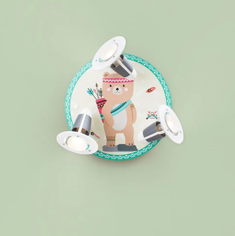 De wandlamp Little Indians is een rond lampje met een mooi dierenmotief, dat met drie lampjes moet worden uitgerust. Het motief toont beer Bjørn in indianenlook en betovert elk plafond of elke muur in de kinderkamer.