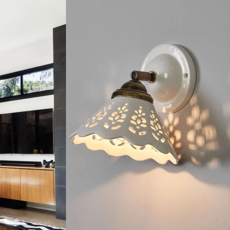 Edele keramische wandlamp PIZZO Deze charmante wandlamp PIZZO is precies goed voor romantisch ingerichte kamers. De wit geglazuurde keramische kap met het decoratieve gaatjespatroon en de gebogen rand doet denken aan kanten stof en zorgt voor een romantische flair. Het licht wordt goed gereflecteerd en naar voren uitgestraald. Door middel van een kogelgewricht kan de lampenkap naar wens worden uitgelijnd.