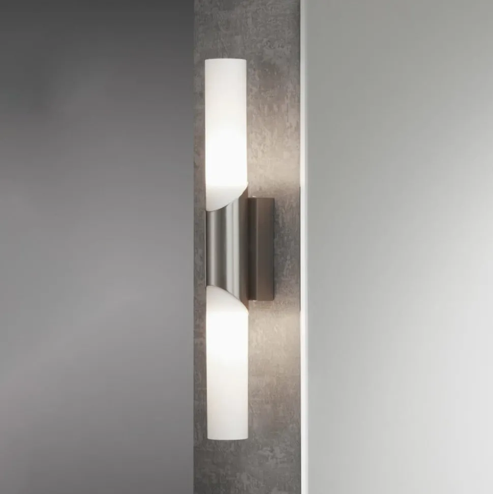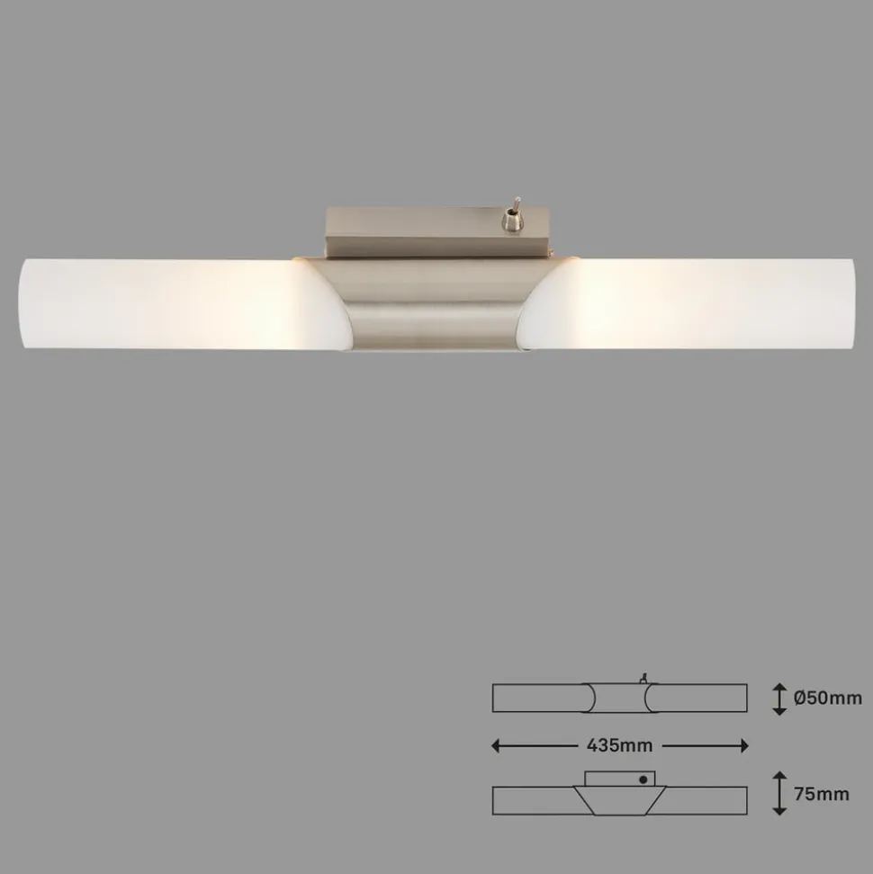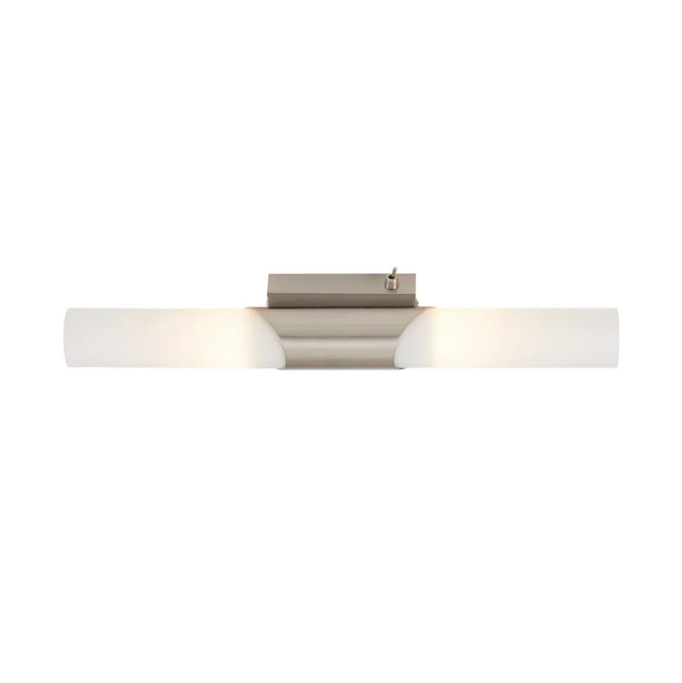 Badkamer wandlamp Splash 2-lamps met tuimelschakelaar De badkamer wandlamp Splash bestaat uit twee matwitte glazen kappen die zorgen voor heldere, niet-verblindende verlichting. Het mat vernikkelde oppervlak zorgt voor contrast. De wandlamp kan naast een spiegel worden geplaatst en zorgt voor passende verlichting in de badkamer. De badkamer wandlamp is voorzien van twee E14 fittingen, die zich achter het buisvormige glas bevinden, en een tuimelschakelaar voor moeiteloze bediening ter plaatse.