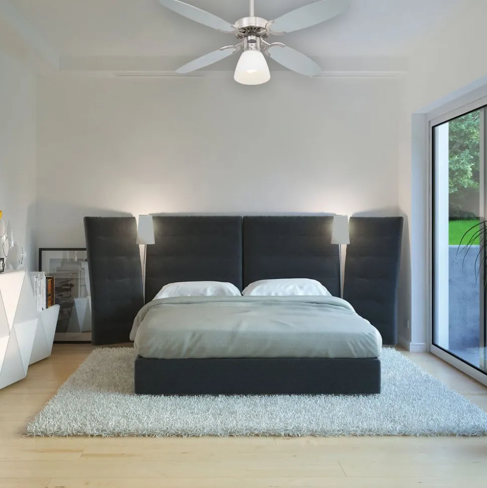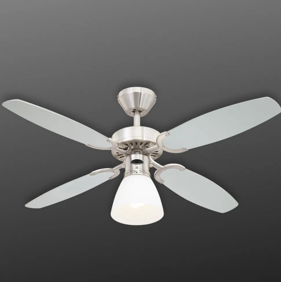 De vierbladige ventilator Capitol bekoort door zijn modern vormgegeven uiterlijk: behuizing en motor zijn van geborsteld staal, de omkeerbare bladen van kunststof zijn aan de ene kant zwart en aan de andere kant zilver. Ze kunnen naar persoonlijke smaak worden opgesteld en aangepast aan de stijl van het interieur.