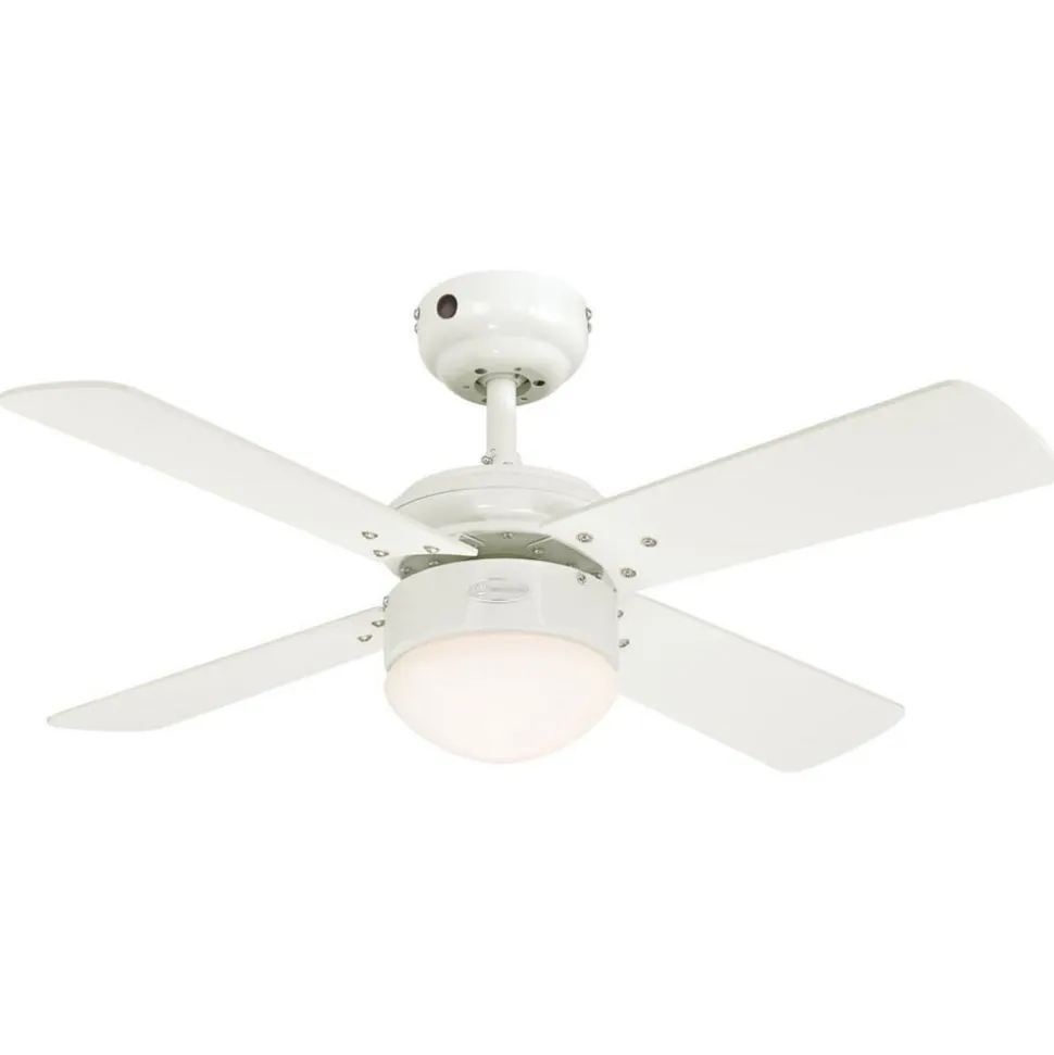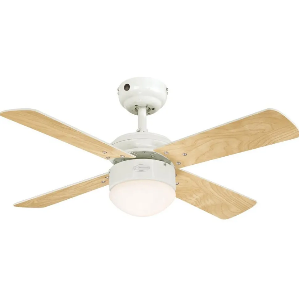 De vierbladige plafondventilator met omkeerbare bladen en geïntegreerde, dimbare LED lamp is modern en elegant vormgegeven. Een luchtverfrisser voor kleinere ruimtes. Een afstandsbediening is inbegrepen, waarmee u niet alleen de ventilator kunt bedienen, maar ook de LED-lamp traploos dimbaar is.