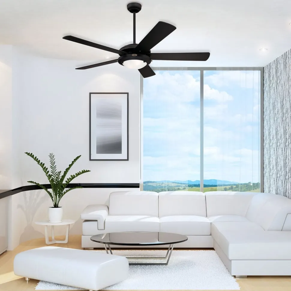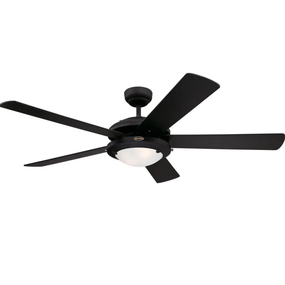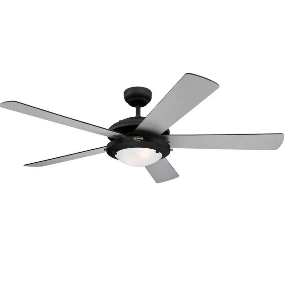 Krachtig en een mooi ontwerp met omkeerbare vleugels in mat zwart en zilver kenmerken de vijfvleugelige plafondventilator Comet, die via een geïntegreerde trekschakelaar wordt bedient. In het midden is een glaslamp ingebouwd, zodat Comet ook de kamerverlichting kan overnemen.