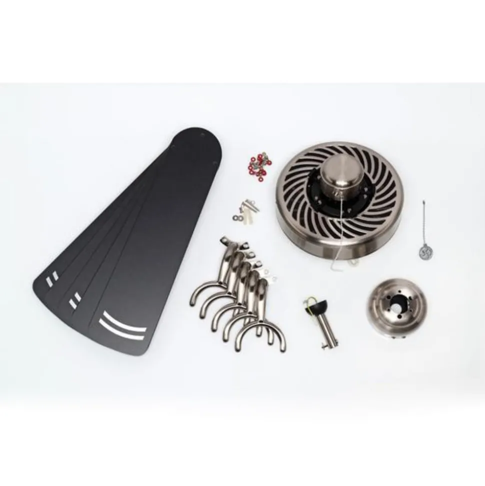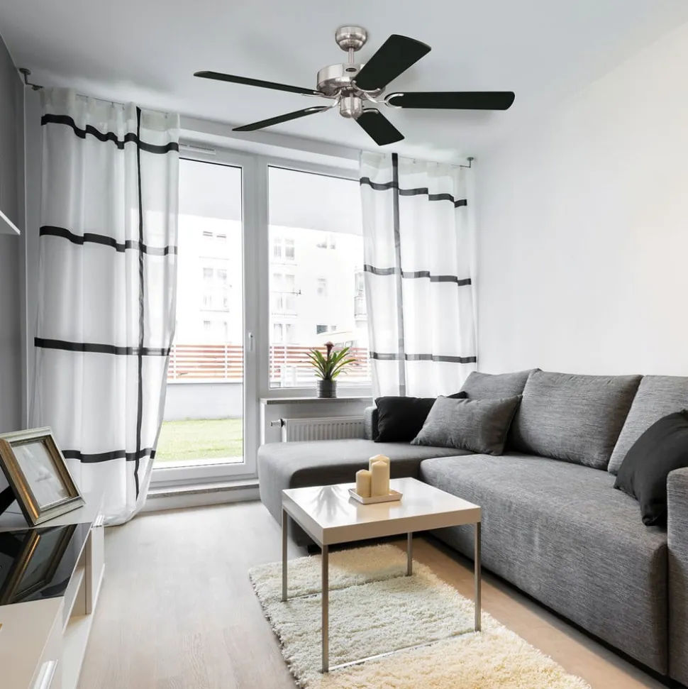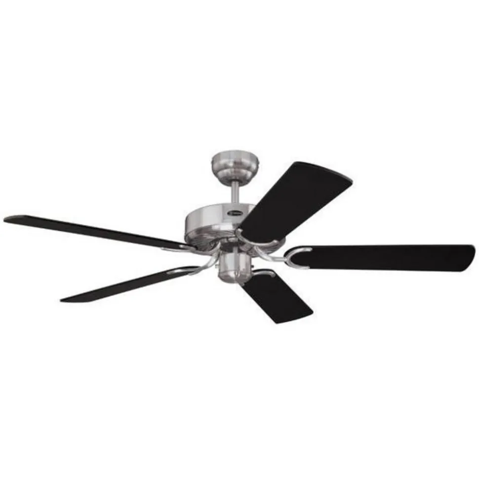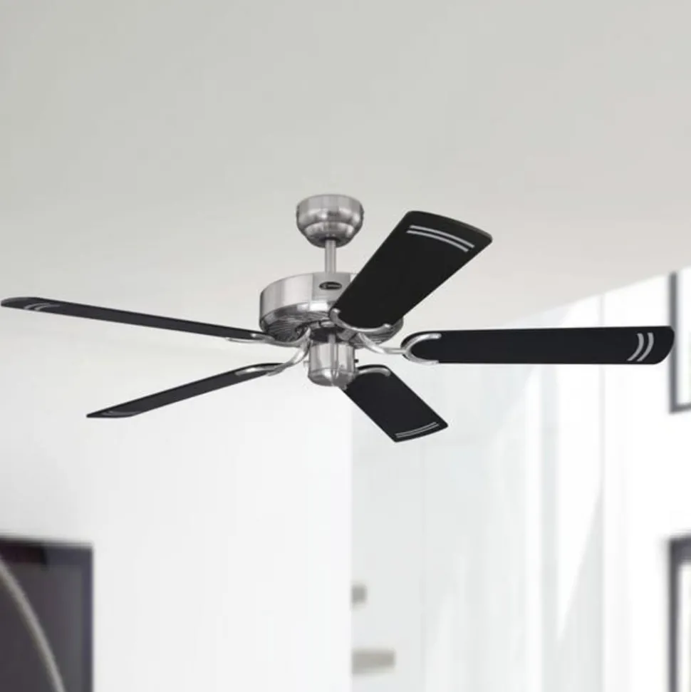 De mooie Cyclone plafondventilator van Westinghouse bekoort met zijn metalen behuizing in geborsteld stalen look. De vijf omkeerbare bladen – één zijde zwart, één zijde zwart-zilver – passen perfect bij elkaar. Cyclone is geschikt voor kamers tot 30 m² woonoppervlak. Voor plafonds hoger dan 3,50 meter moet een verlengpaal worden gebruikt (zie accessoires).