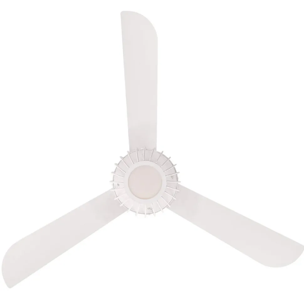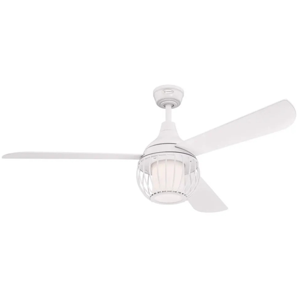 De plafondventilator Graham is een witte plafondventilator, die met drie kantelbare rotorbladen is uitgerust. De moderne, kooivormige lampenkap plaatst zich beschermend om de diffuser uit gemateerd opaalglas. De LED levert zo een warmwit, gedempt licht.