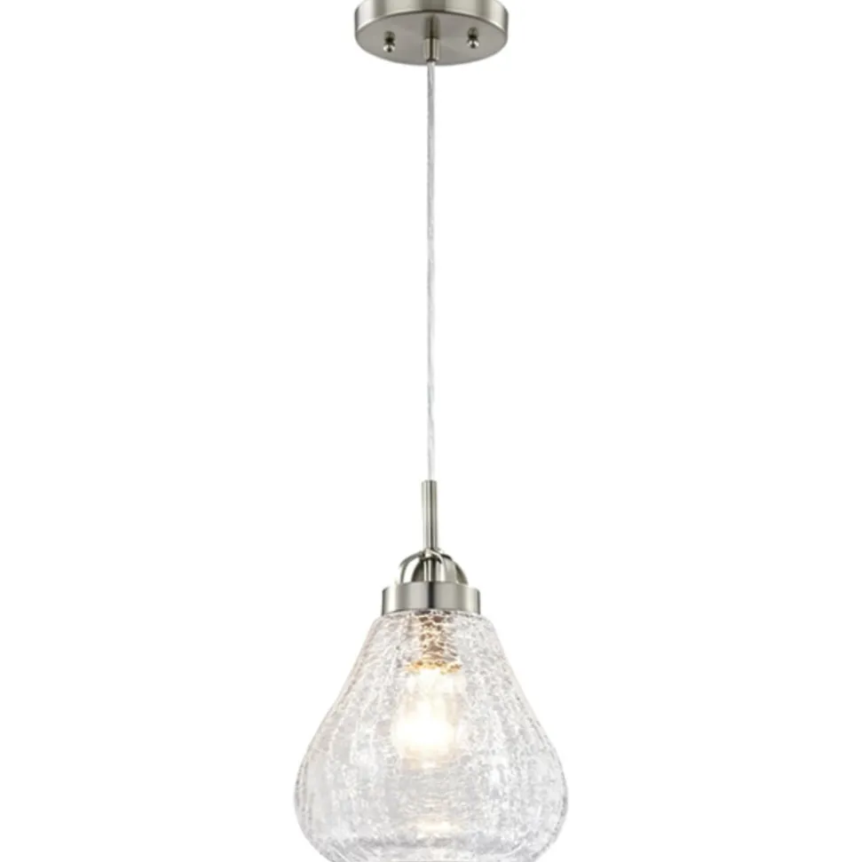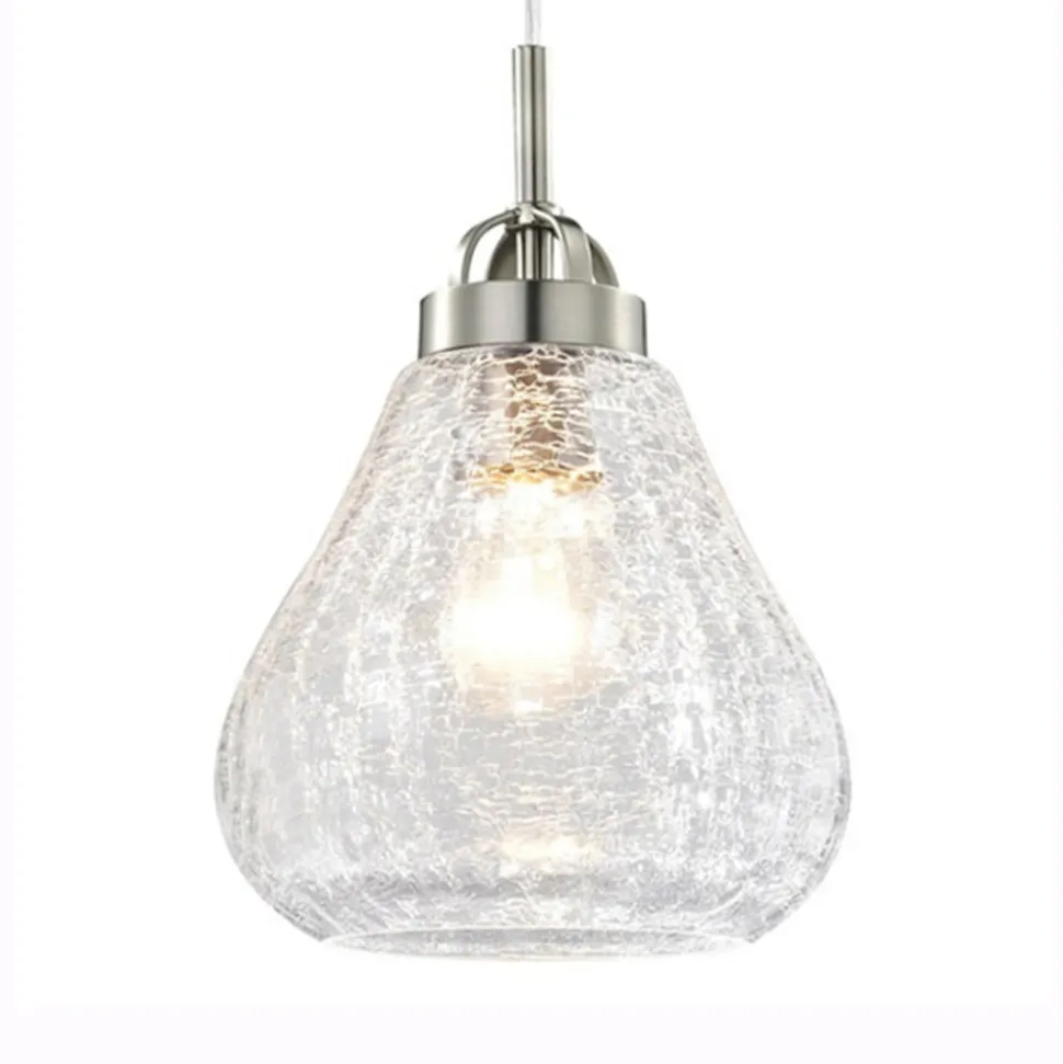 Elegante hanglamp met lampenkap in gebroken glaslook De delicate ophanging van deze hanglamp wordt aangevuld door een druppelvormige glazen lampenkap. Dankzij de transparante kap kan het licht zich ongehinderd verspreiden en zorgt het voor een heldere verlichting. Het ruwe oppervlak van het glas voorkomt dat het licht verblindt. Deze moderne lamp is ideaal in een keuken boven het keukenblok of in een woonkamer boven een tafel.