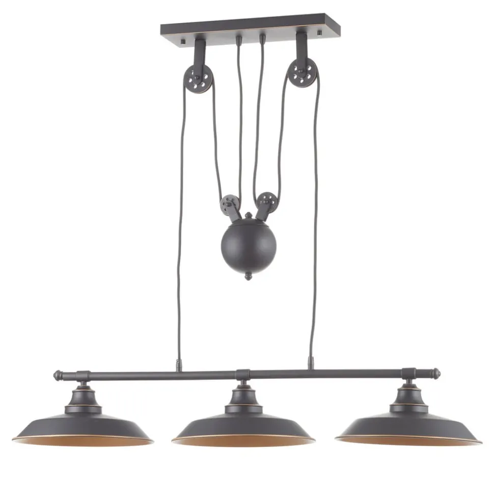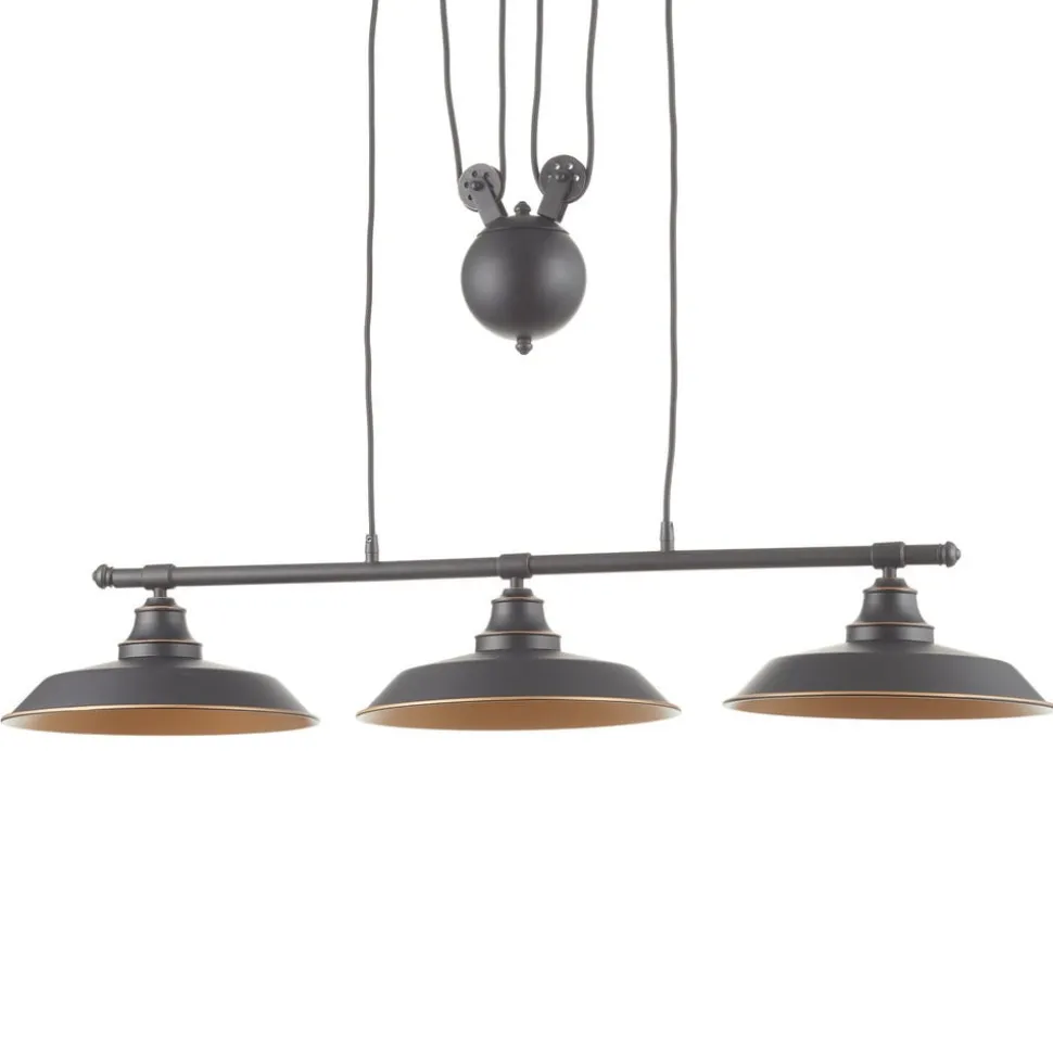 Iron Hill bestaat uit drie lampenkappen die, dankzij hun brede opening, een goed zicht op de lamp mogelijk maken. Om het industriële ontwerp perfect af te ronden zijn er bijpassende gloeilampen in vintage-look aan de accessoires toegevoegd. De lampenkappen zijn bevestigd aan een treksysteem. Hierdoor kan de ophanging van de armatuur worden aangepast aan de persoonlijke wensen.