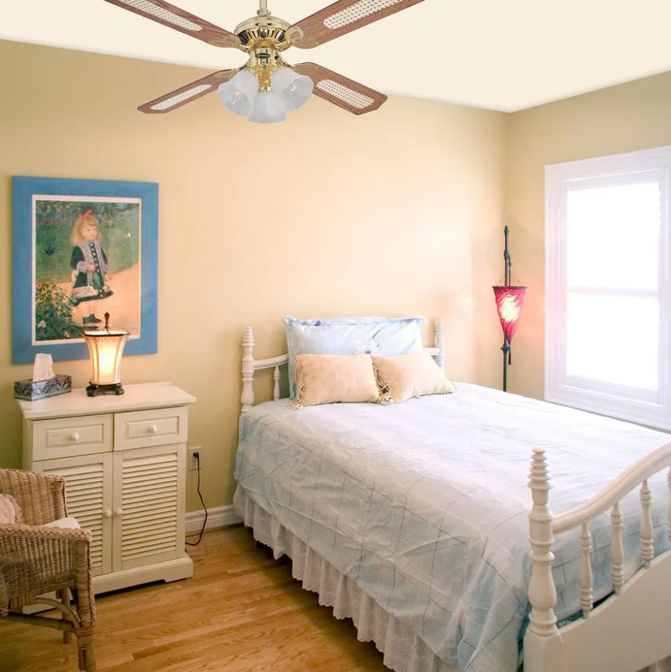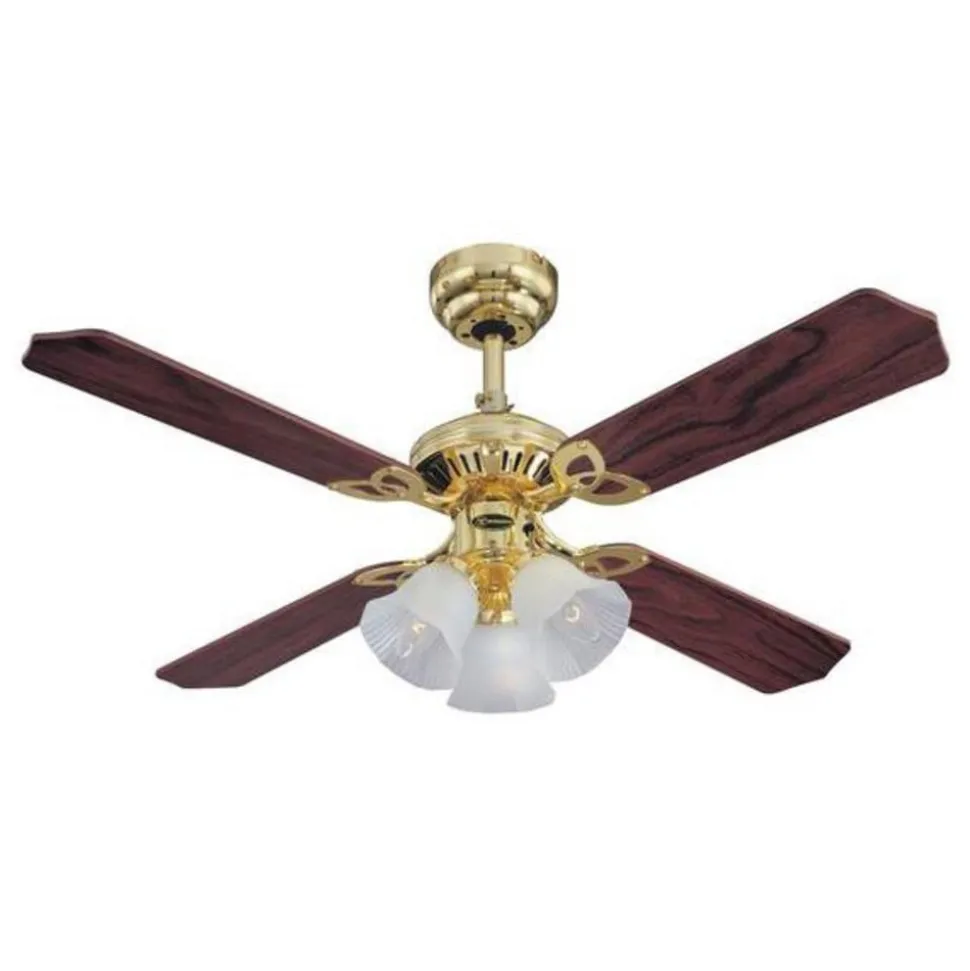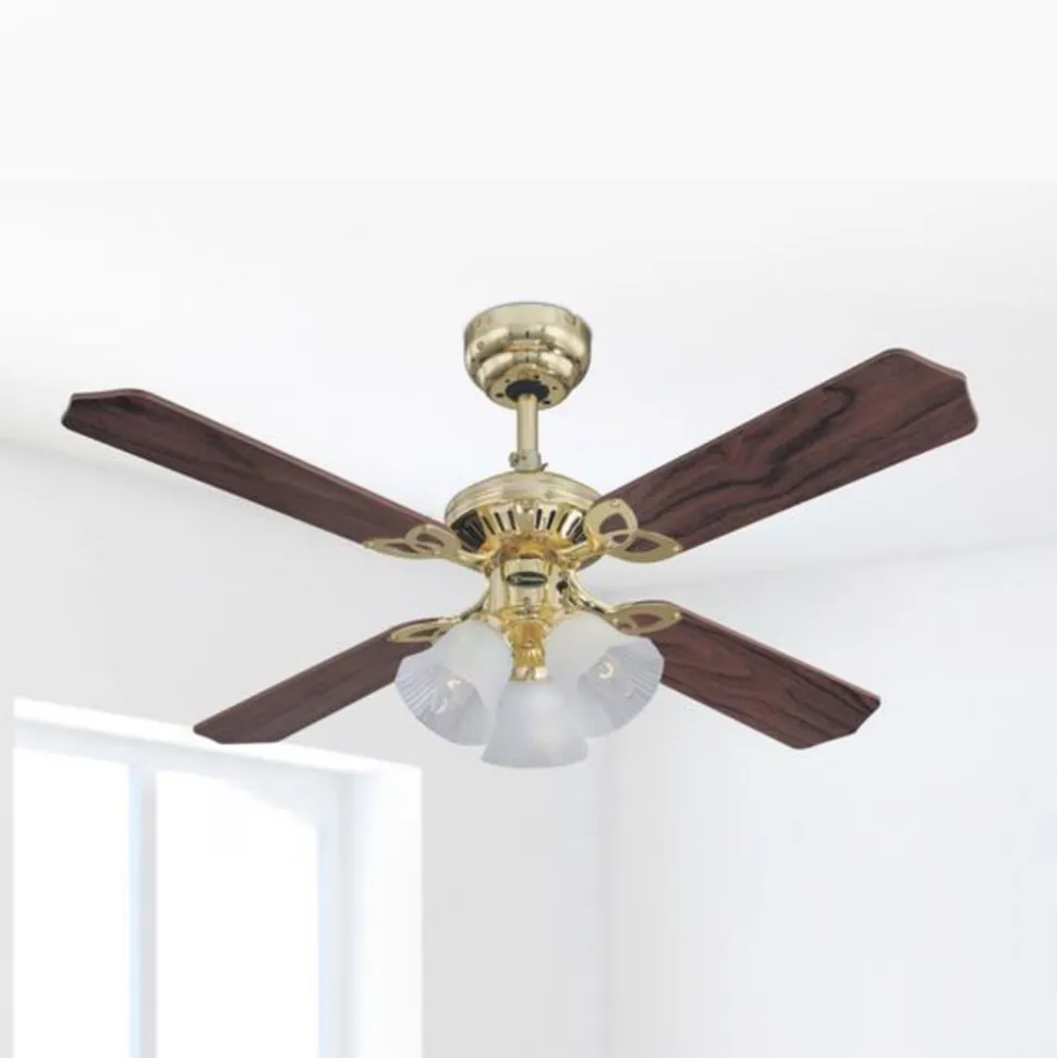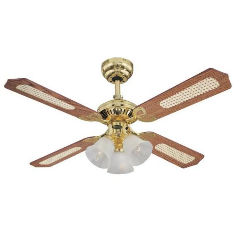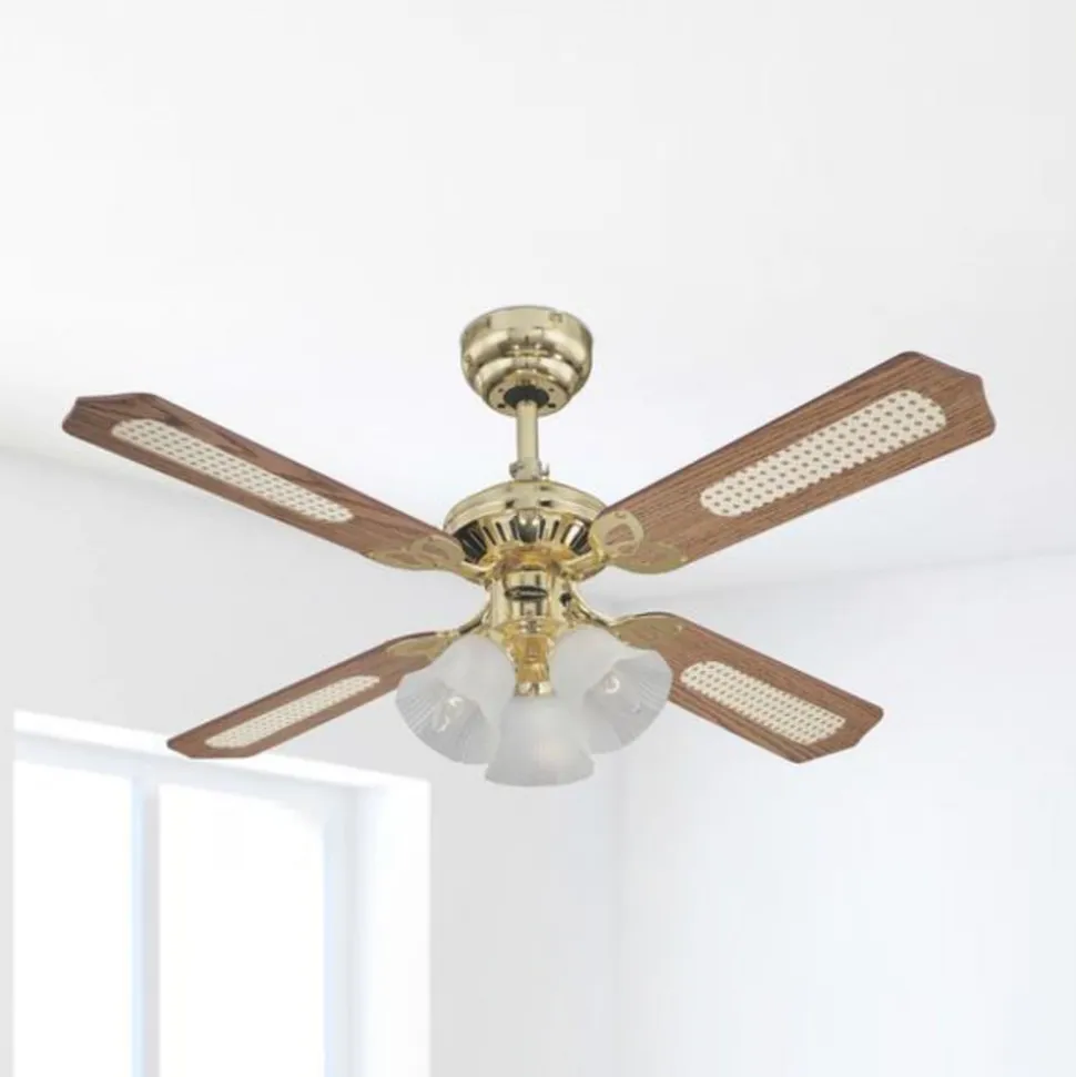 Stijlvolle Princess Trio plafondventilator in hout- en rotanlook De decoratieve Princess Trio plafondventilator maakt indruk met het elegante ontwerp van de metalen behuizing met een afwerking van gepolijst messing. De ventilator heeft vier omkeerbare bladen met rotanapplicaties en een fraaie houtlook rondom, naar keuze in eiken of mahonie. Ze creëren een stijlvolle sfeer. Princess Trio functies zijn voorzien van verlichting: Drie betoverende lampenkappen van elegant gesatineerd glas zorgen voor sfeervolle sfeerverlichting. De lichtbronnen worden niet meegeleverd. De drietrapsventilator kan worden bediend met de trekschakelaar. Als de plafondhoogte 350 cm of meer is, wordt het gebruik van een geschikt verlengstuk aanbevolen (zie accessoires). Met de functie vooruit of achteruit – instelbaar via de geïntegreerde schuifregelaar – kan worden omgeschakeld tussen zomer- en winterstand. De zomerfunctie wordt gebruikt voor koeling bij warm weer, terwijl de winterfunctie gebruik maakt van warmtecirculatie om tot 30% te besparen op de verwarmingskosten. Technische gegevens Vermogen: 45/32/23 watt Toerentallen: 210/145/85 tpm Bijzonderheden Dankzij de extreem stille werking van de motor is de Princess Trio plafondventilator ook geschikt voor gebruik in slaapkamers.