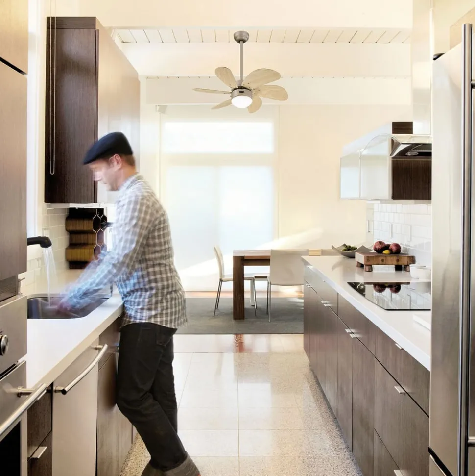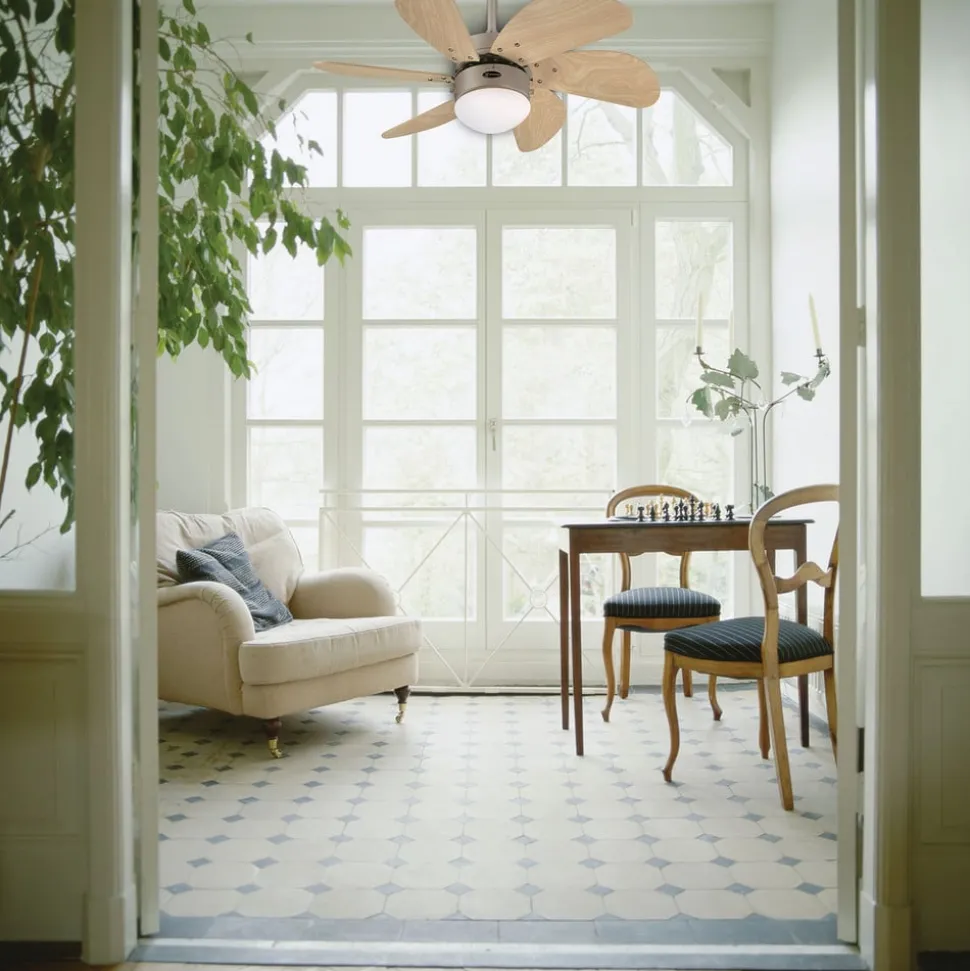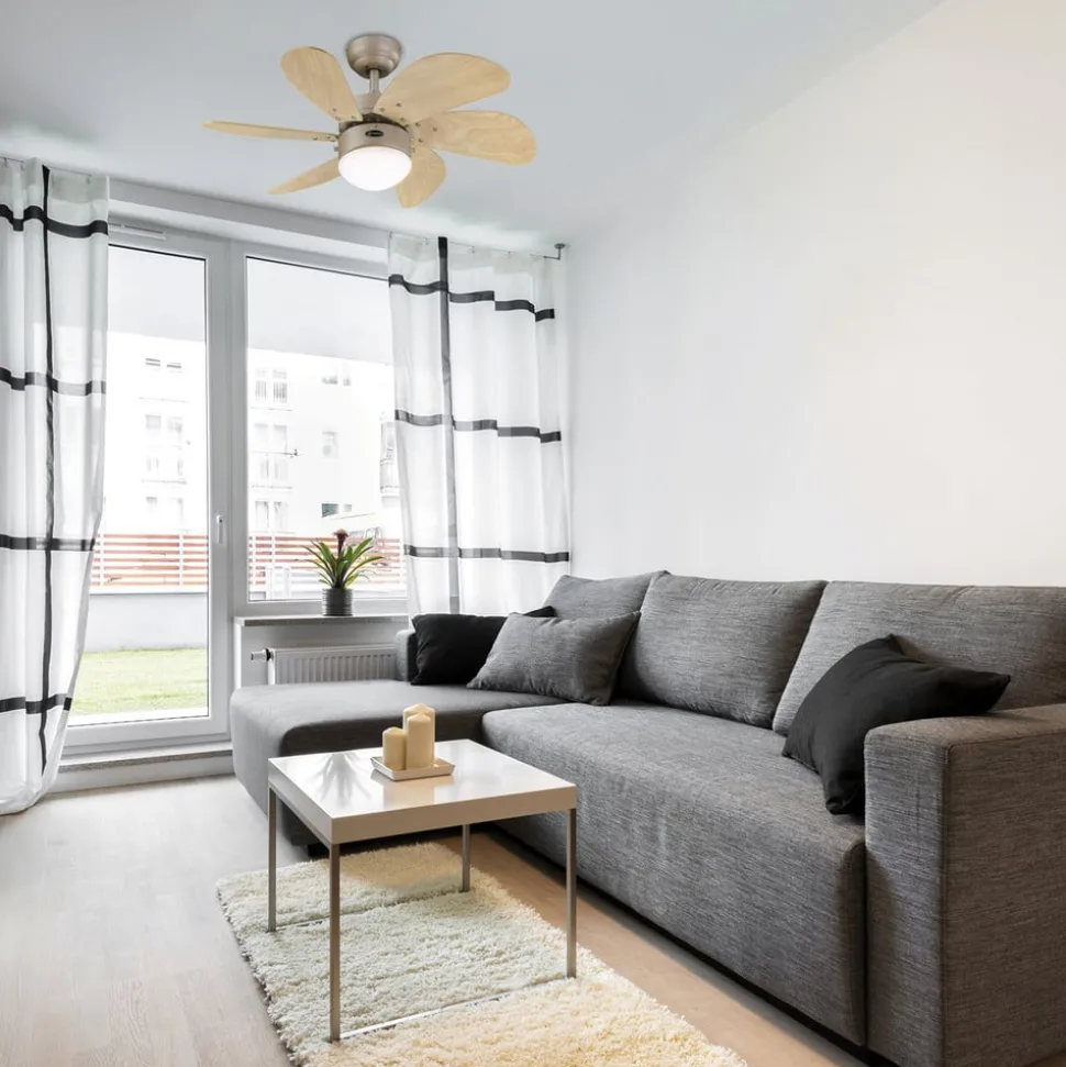 Plafondventilator Turbo Swirl met zes lamellen – titaniumkleurig De plafondventilator Turbo Swirl met titaniumkleurige behuizing heeft een charmante uitstraling. Met een diameter van 76 cm kan hij worden gebruikt in kleine kamers tot 12 m². Turbo Swirl heeft een visueel aantrekkelijke laagliggende behuizing met een uitstekende kap van wit glas. De lamellen zijn omkeerbaar en kunnen worden gemonteerd in een esdoorn of witte afwerking. Voor plafonds hoger dan 3,5 m moet een verlengstuk worden gebruikt (zie accessoires). Functies Er is een trekschakelaar voor het bedienen van het armatuur en de ventilator met drie snelheden. Op verzoek kan achteraf een afstandsbediening of schakelaar worden gemonteerd (zie accessoires). De ventilator is uitgerust met een schuifregelaar voor het instellen van de voorwaartse en achterwaartse werking. Door de draairichting te wijzigen, wordt overgeschakeld van zomer- naar winterfunctie. De zomerfunctie zorgt voor luchtkoeling, de winterfunctie werkt met warme luchtcirculatie en is nuttig om te besparen op verwarmingsenergiekosten. Deze kunnen tot 30% lager uitvallen. Technische gegevens Vermogen per snelheid: – 26 watt bij 130 tpm – 37 watt bij 190 tpm – 53 watt bij 250 tpm