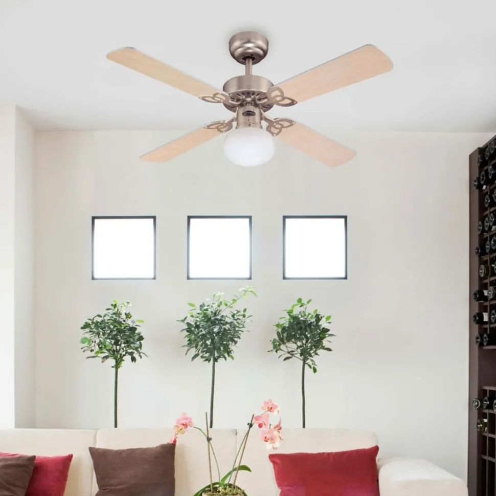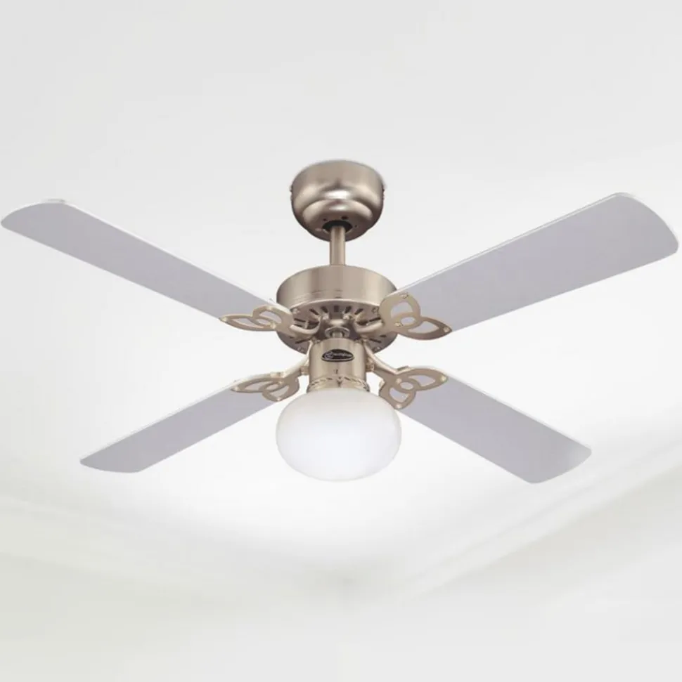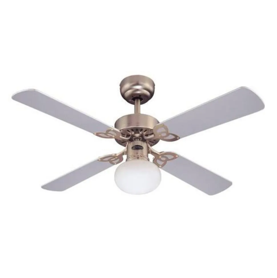 Plafondventilator Vegas straalt elegante flair uit – omkeerbare bladen in ahorn en zilver Deze ventilator, die zeer stil is in gebruik, wordt gekenmerkt door zijn duurzaamheid als product van het merk Westinghouse met 10 jaar garantie op de motor. Geleverd exclusief lamp. Via de accessoires kan ook een wandschakelaar of afstandsbediening worden besteld. Functies Motorvermogen en snelheid kunnen elk in drie stappen worden geschakeld. Vegas is uitgerust met een schakelaar voor vooruit en achteruit: hij zorgt voor een frisse bries in de zomer en helpt de verwarmingskosten in de winter laag te houden (min ca. 30 %). Voorzien van schuifschakelaar (vooruit en achteruit) en trekschakelaar. Technische gegevens Vermogen per snelheid: – 37 watt bij 110 tpm – 39,6 watt bij 162 tpm – 47,4 watt bij 210 tpm