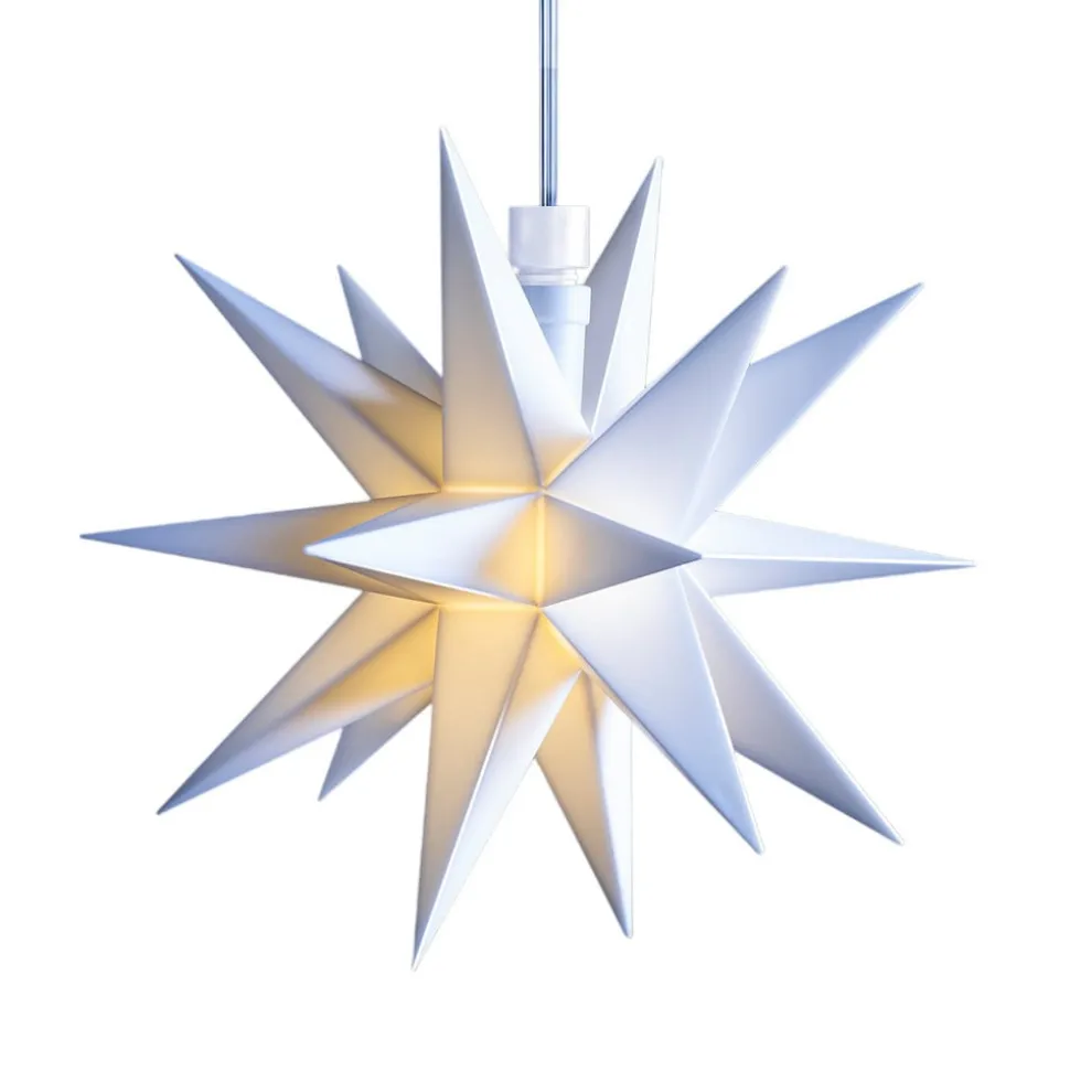 De witte ster met een diameter van 12 cm en ingebouwde LED-verlichting blijkt een absolute blikvanger. Het is gemaakt van kunststof en heeft een 500 cm lange, transparante kabel, die voldoende ruimte biedt om de ster naar wens te plaatsen, bijvoorbeeld voor het raam. De benodigde transformator is inbegrepen.