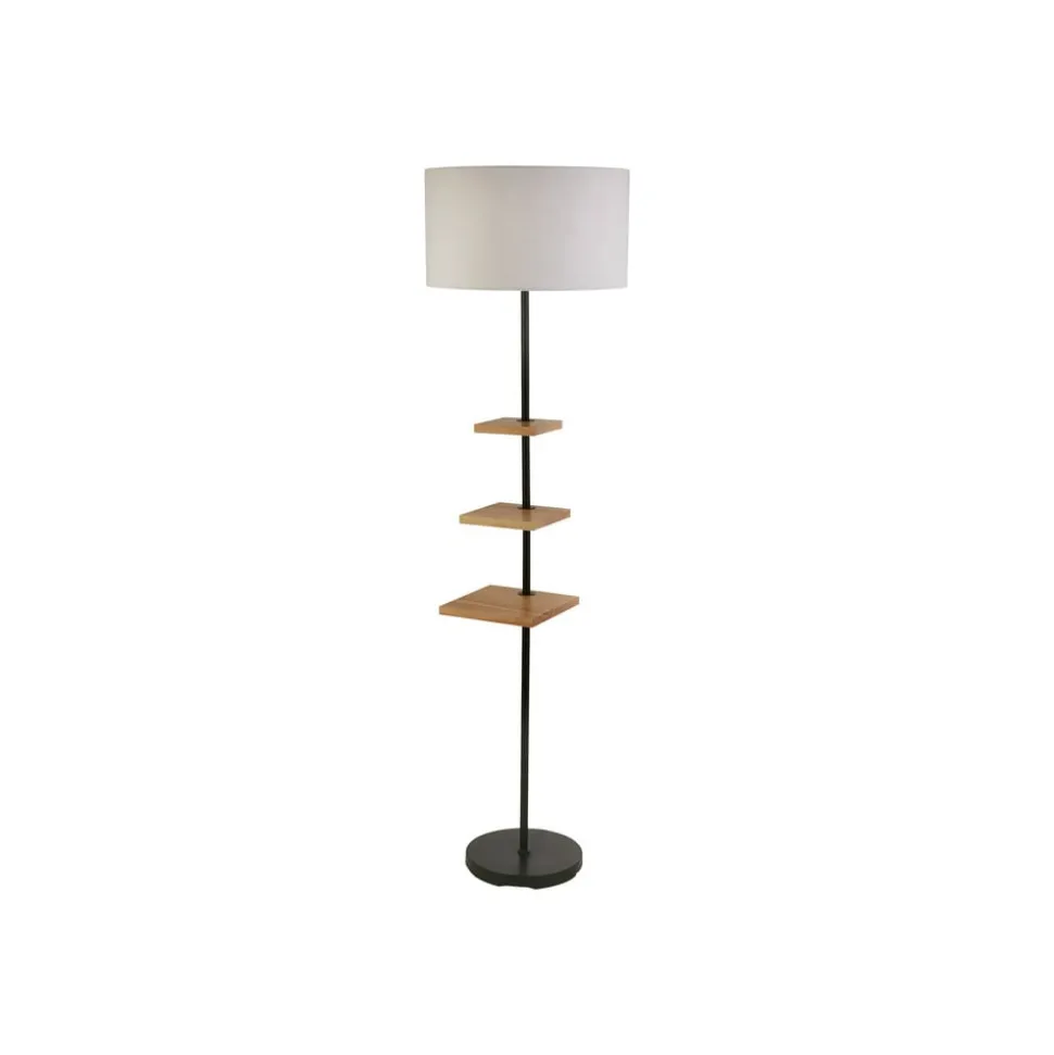 Stalen vloerlamp X Norfolk met drie houten planken en stoffen kap Die vloerlamp X Norfolk is uitgerust met drie houten planken van verschillende Gross, die elk belast kunnen worden met maximaal 0,5 kg, en dient als een uniek en expressief Element in elke woonkamer. Met haar grijze stoffen drumkap straalt deze vloerlamp een warm en uitnodigend licht uit in elke kamer. De binnenkant van de kap is wit, Wasen zorgt voor een bijzonder goede reflectie en verdeling van het licht. Een voetschakelaar (aan/uit) is geïntegreerd in het snoer van de stekker. X Norfolk heeft ruimte voor een vrij te kiezen E27 lamp (niet inbegrepen, zie accessoires).