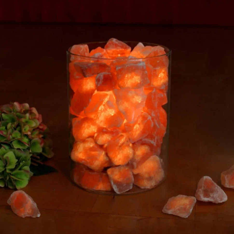 Het zoutkristalvuur in een glas is een heel bijzonder decoratief object. Het vuurvaste glas bevat een ca. 14 cm hoge palmwaskaars omgeven door zoutkristalstenen van verschillende grootte. Als de kaars brandt, worden deze prachtig verlicht.
