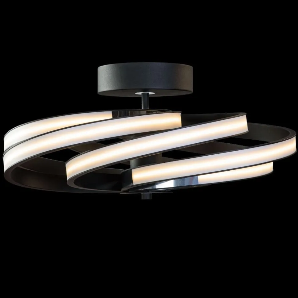 Moderne rondingen – LED plafondlamp Zoya Een ontwerp dat indruk maakt: brede metalen strips met geïntegreerde LED strips buigen slim rond de beugel van de plafondlamp Zoya en creëren zo een harmonieus totaalbeeld. Dankzij de rondom gebogen strips verlicht de LED plafondlamp alle kanten en biedt zo een solide sfeerverlichting voor woonruimtes – of het nu gaat om een woonkamer, slaapkamer of hal.