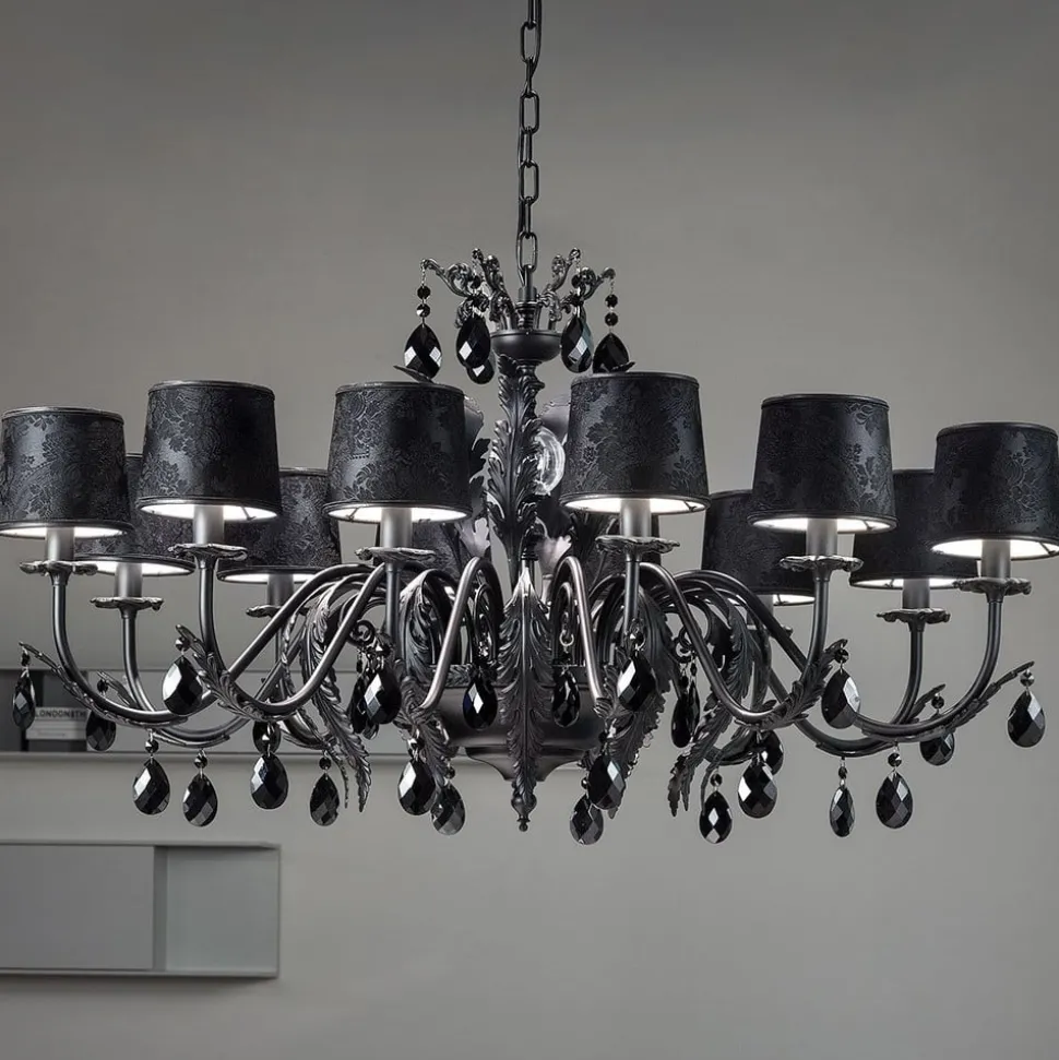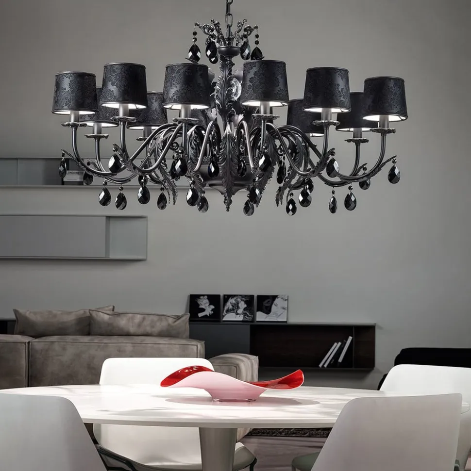 Met Asfour-kristallen en edele lampenkappen uit damast – zwarte kroonluchter Angelis